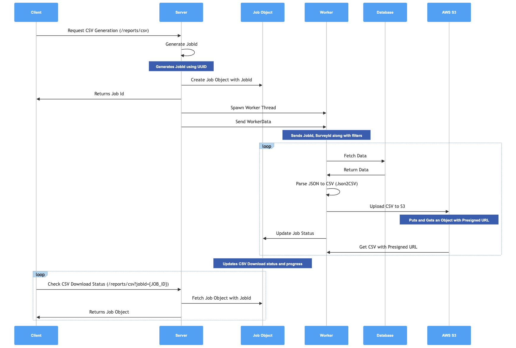 On the server side, we orchestrate a series of operations to manage CSV generation and status checks. Here’s how it all comes together: